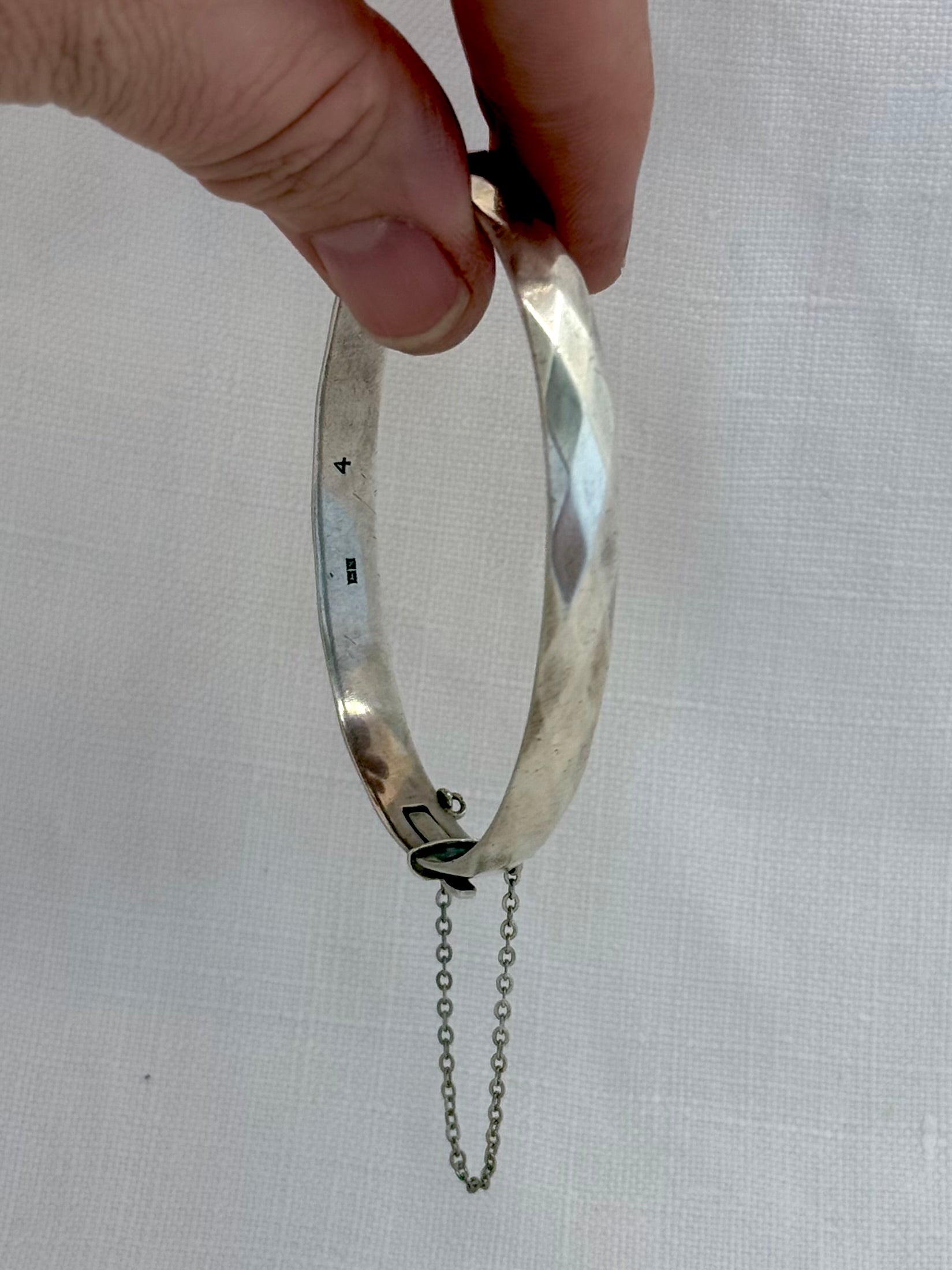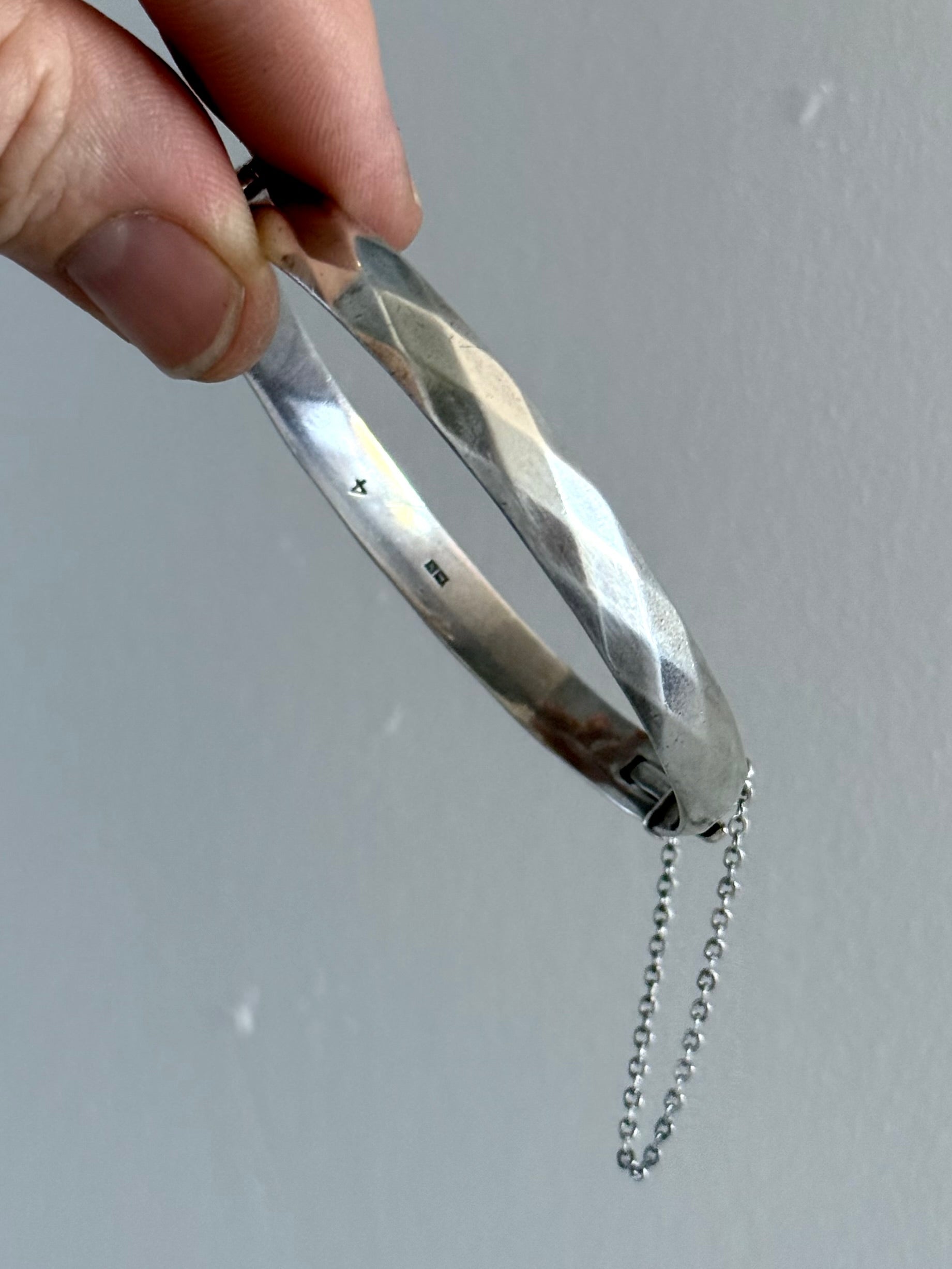 .1961 .925 Birmingham diamond faceted sterling silver hallmarked mid century modern harlequin clasp bangle
