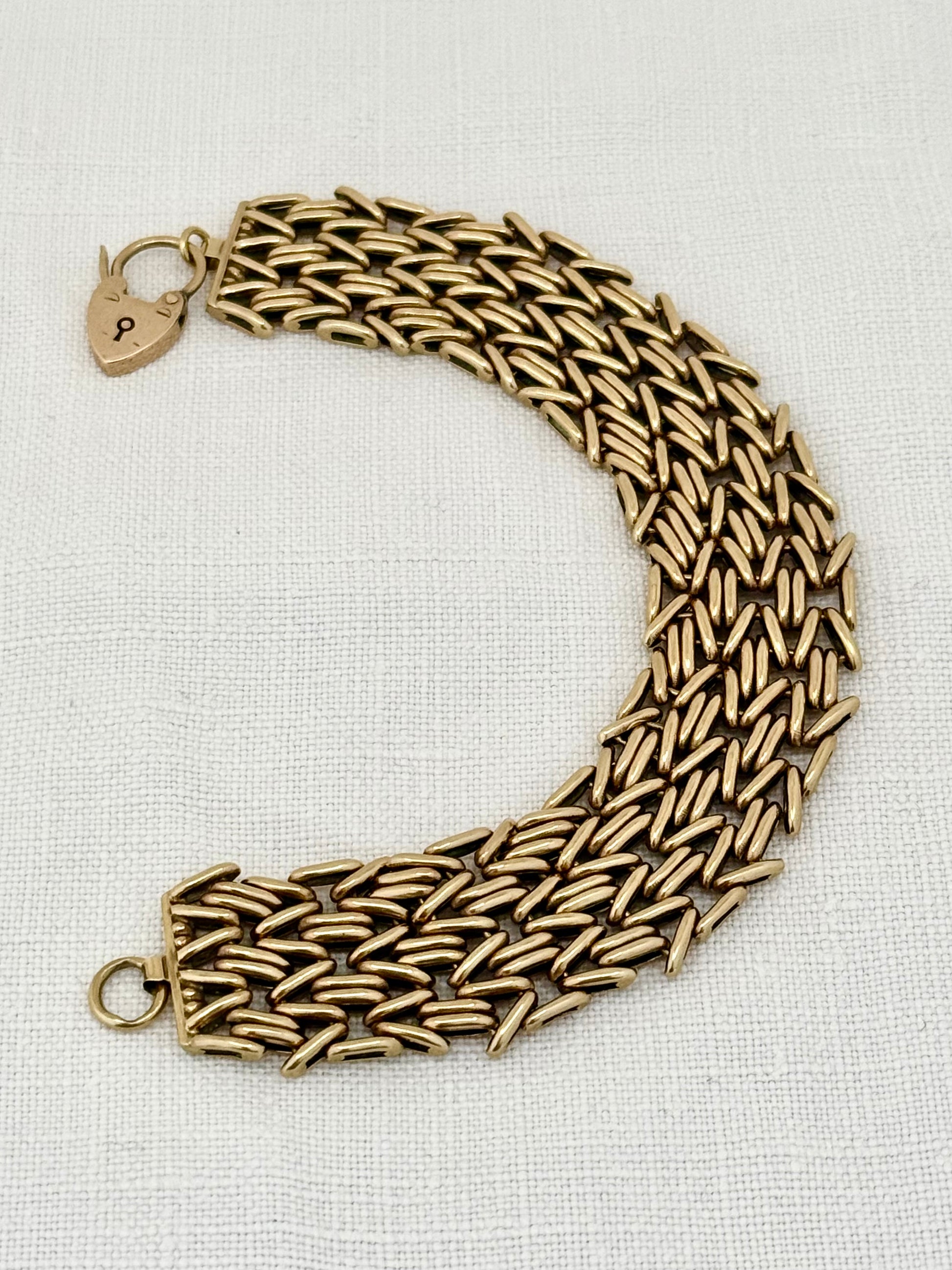 .1960 .1964 .375 9ct gold solid fancy link wide chunky width fancy link gate chain chain bracelet with gold heart padlock clasp
