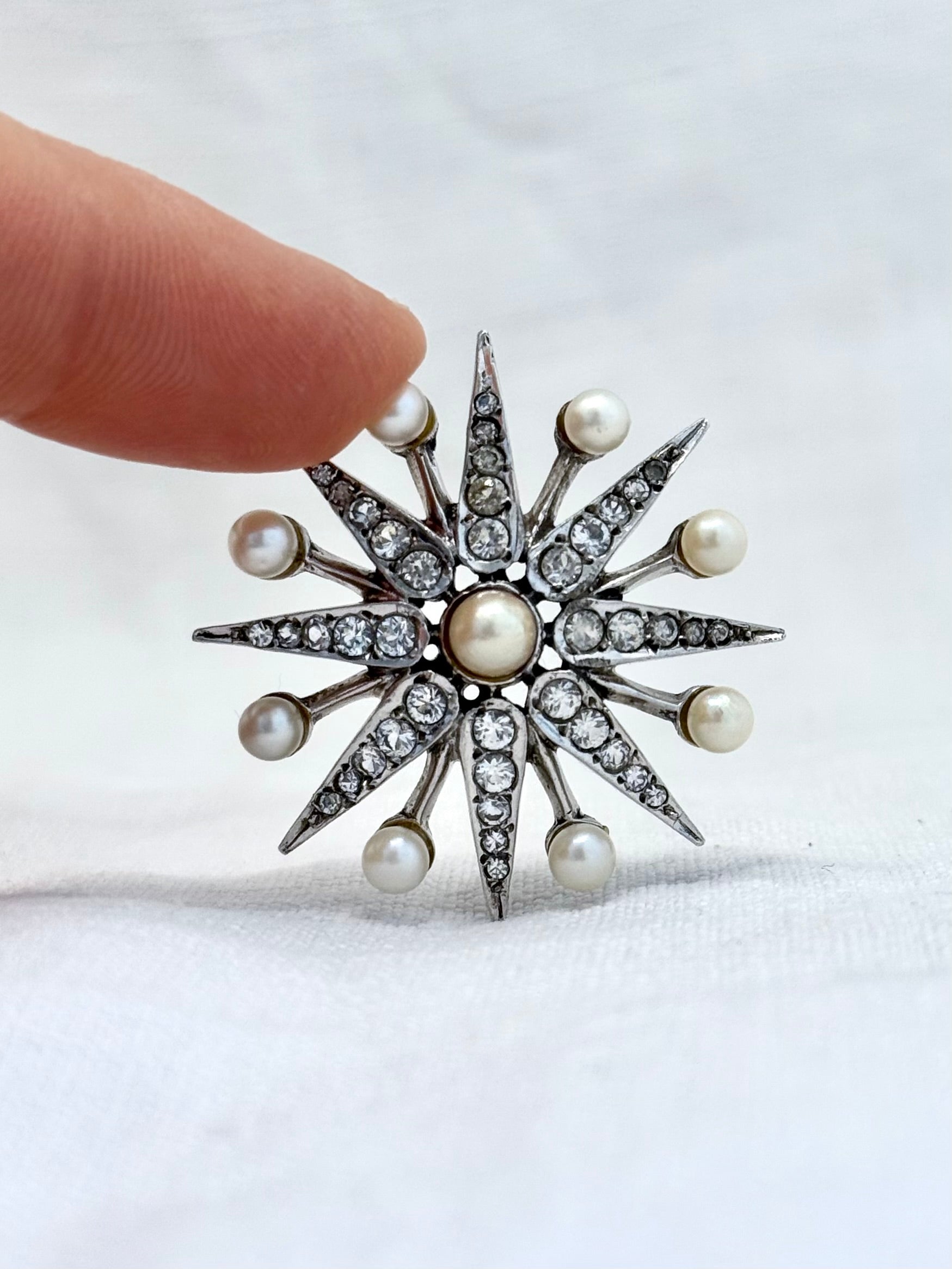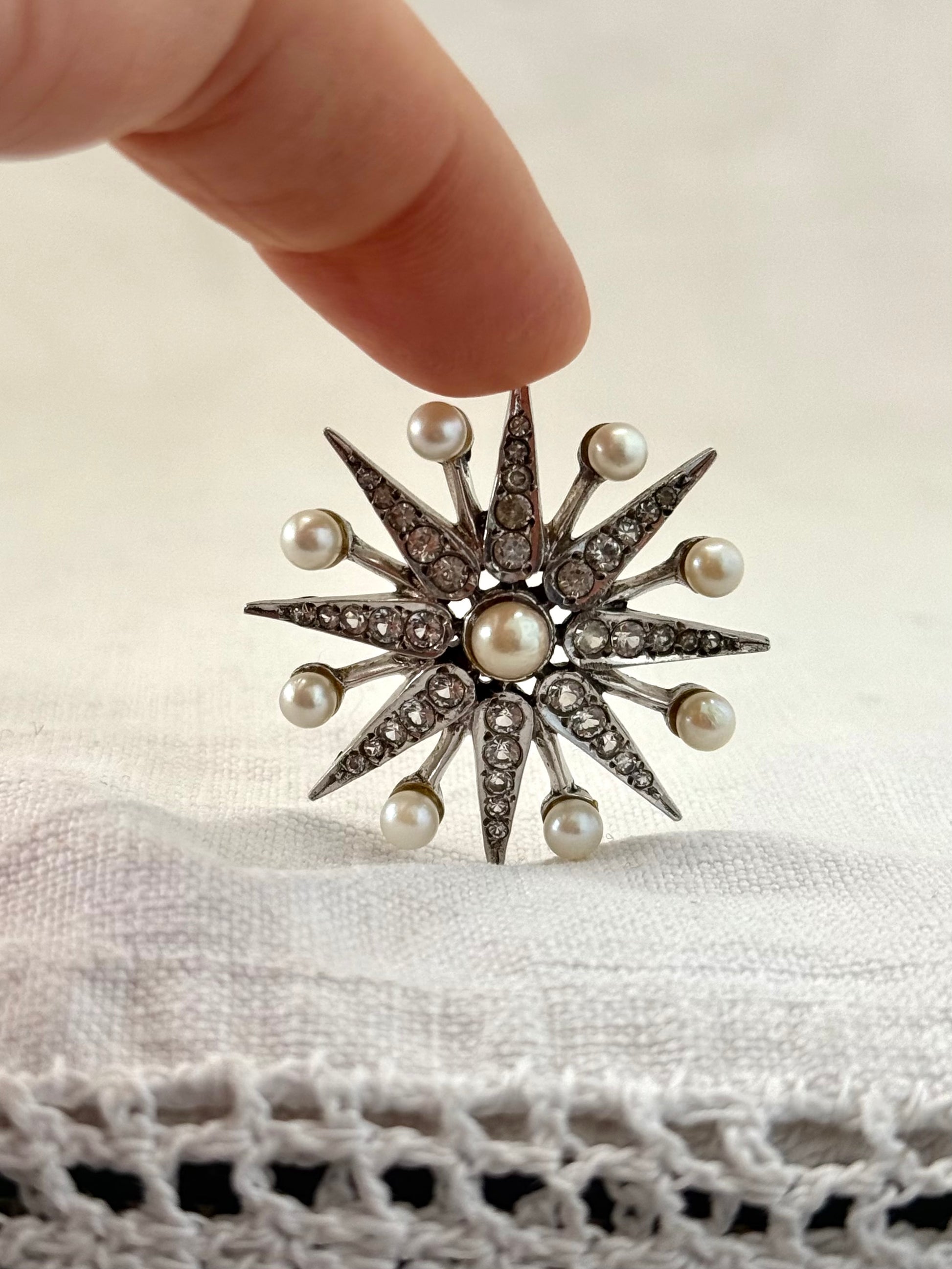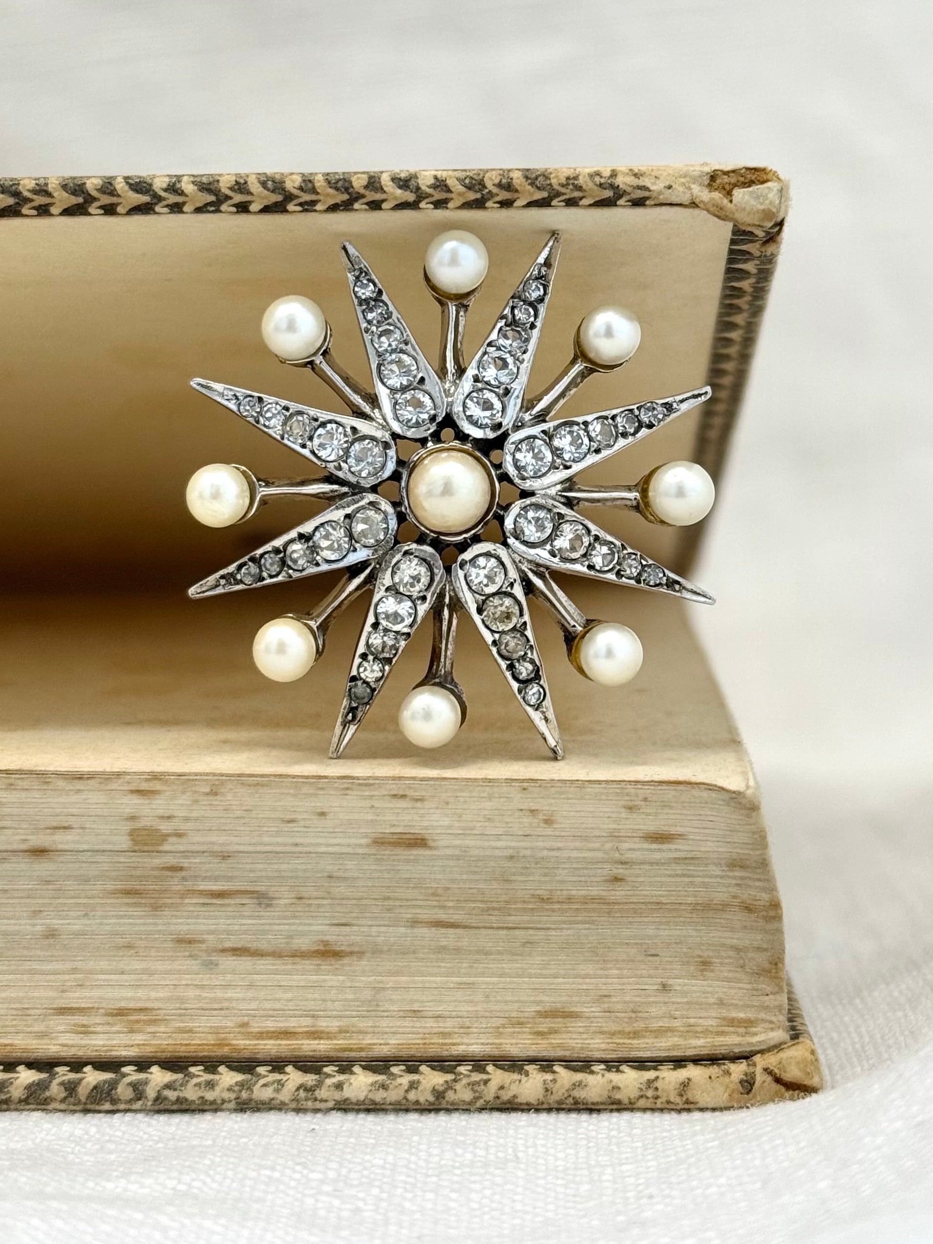 .1968 .925 Victorian revival 8 pointer sterling silver starburst star pendant with pearl and pave set diamanté gemstones