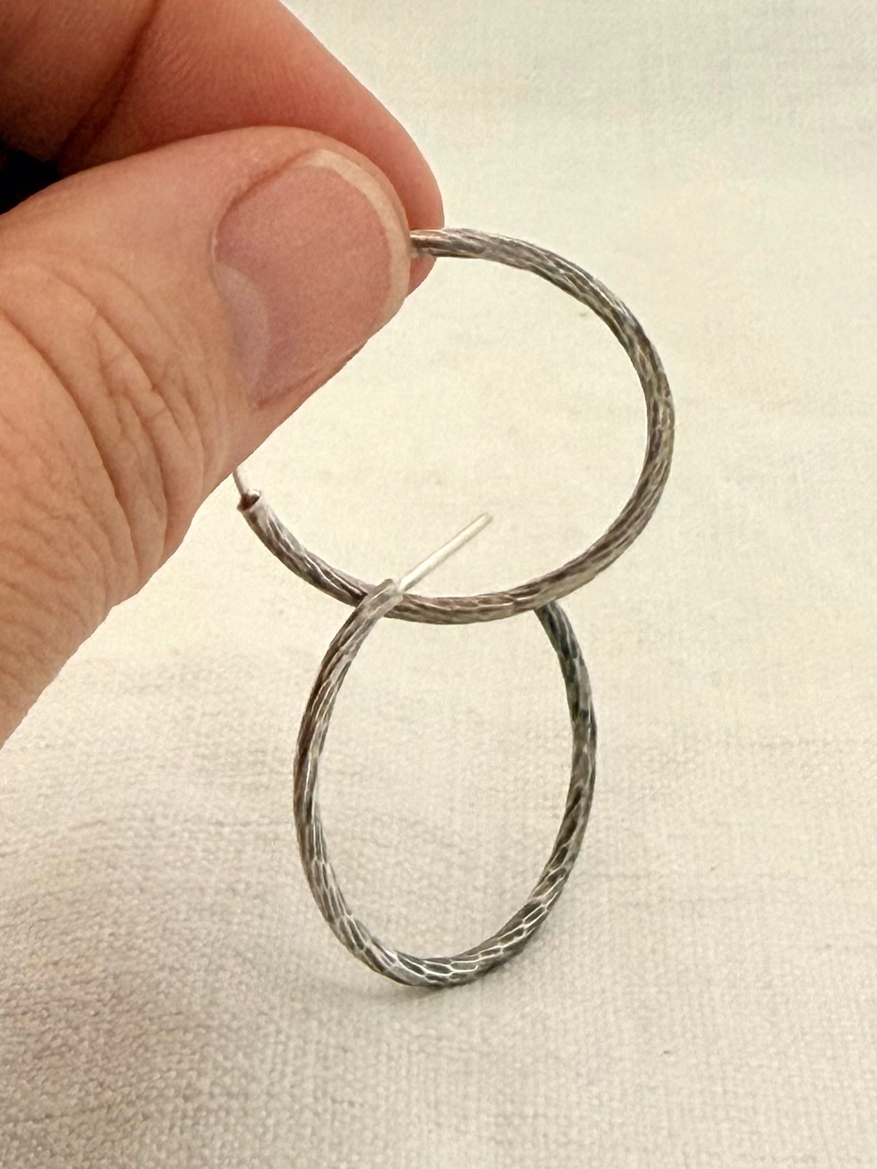 .1970s .30mm hoop .925 textured hand made modernist medium sized sterling silver hoop push in stud earrings
