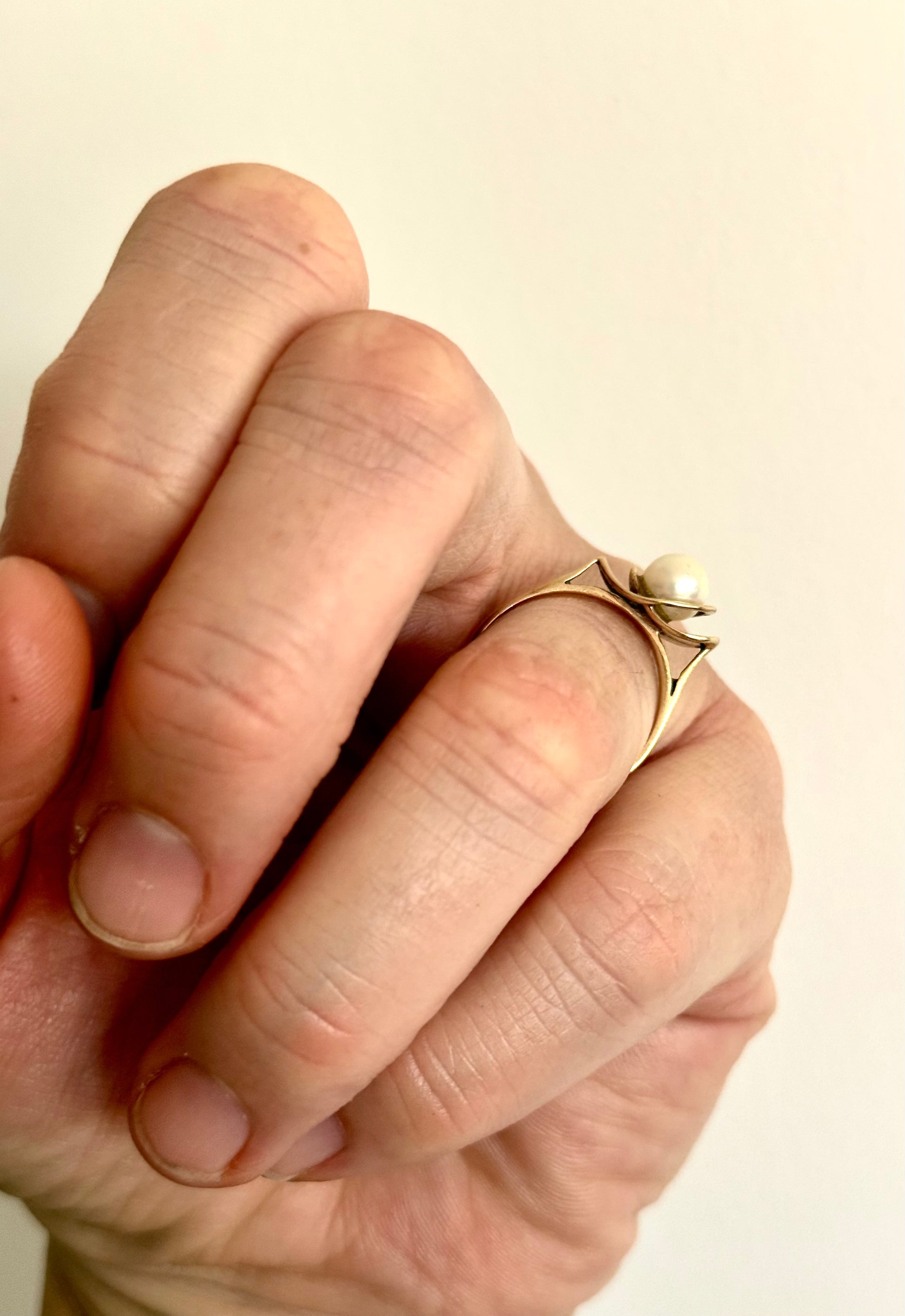 .1970s .375 .9ct Akoya white pearl Architectural free form yellow gold pearl cocktail ring dress ring