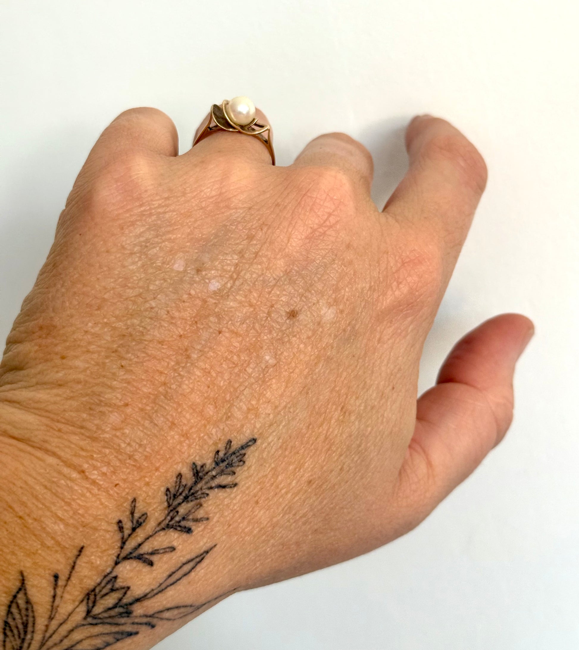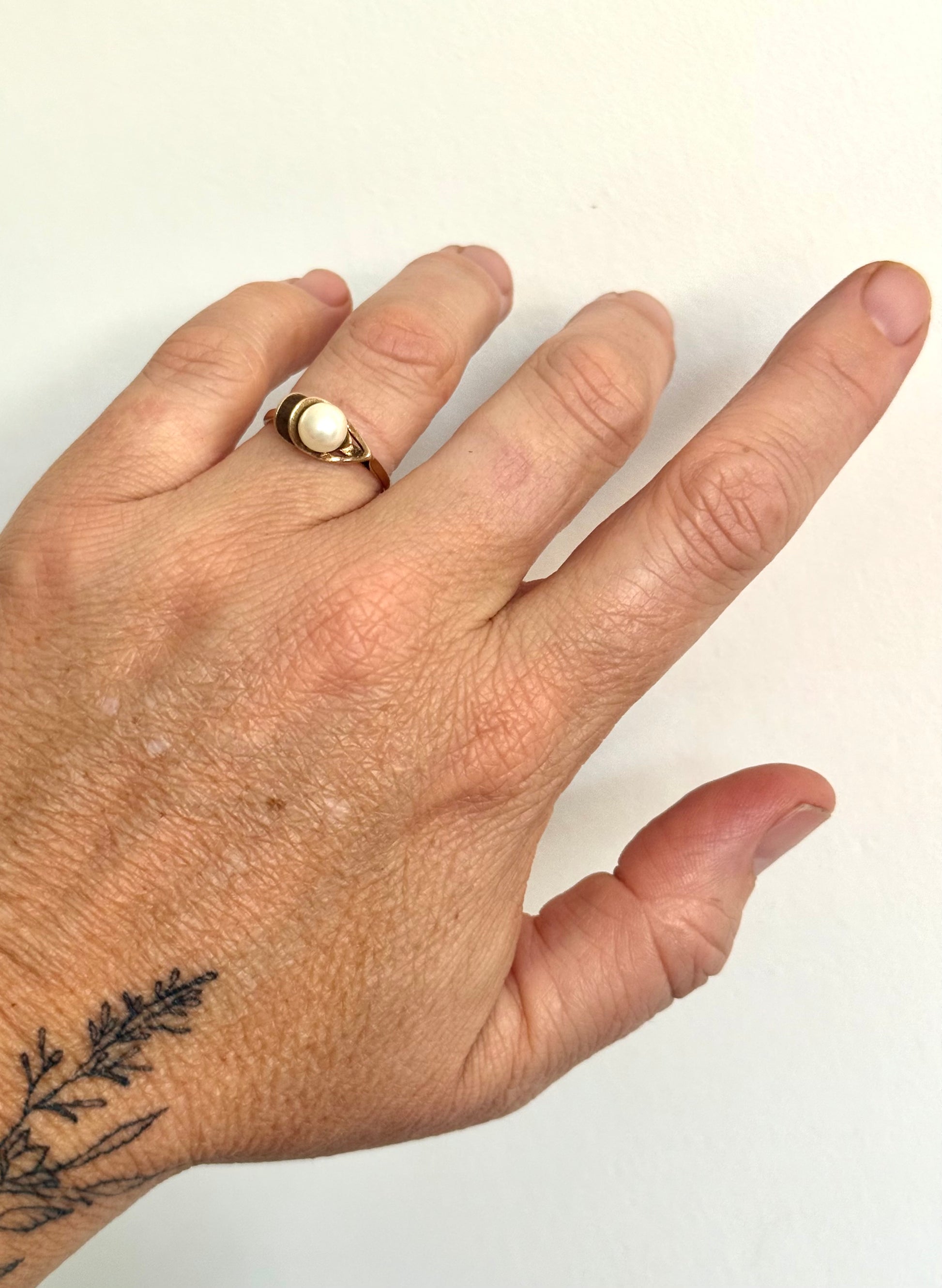 This etherial 9ct yellow gold ring holds the single pearlescent Akoya pearl in a setting that truly celebrates the beauty of the pearl.