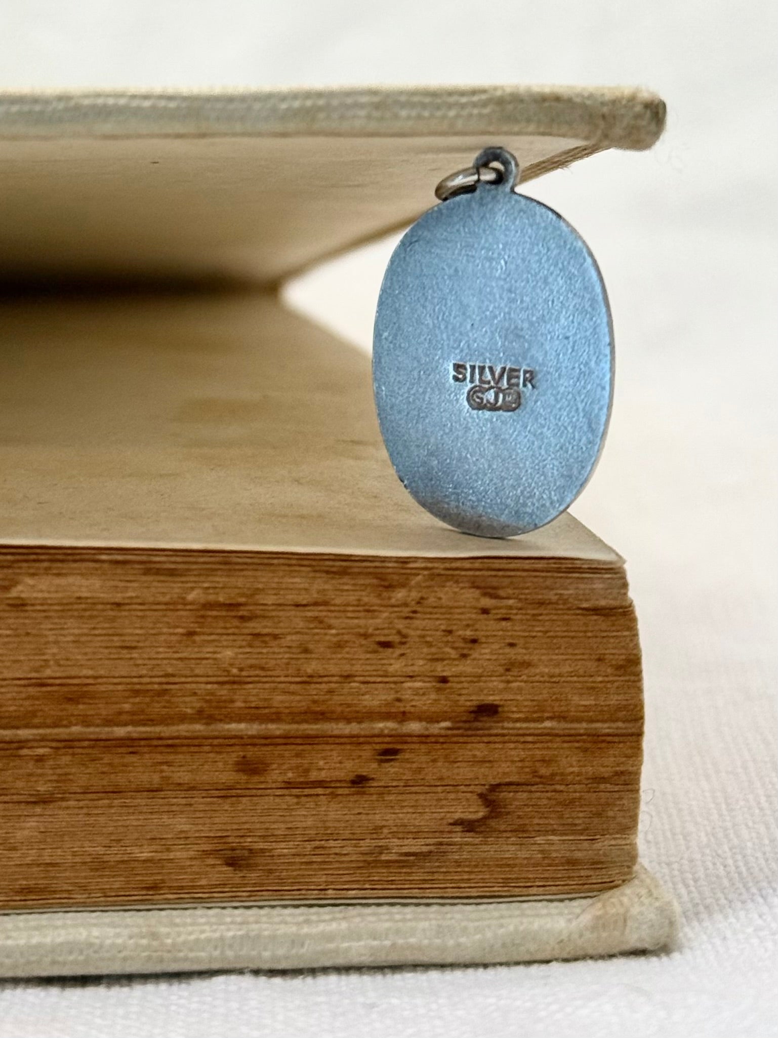 This lovely sterling silver Saint Christopher token pendant is oval in shape with a script reading for “entrust thy safety to St. Christopher” and the centre decal of Saint Christopher is coloured with a turquoise enamelling. The Saint Christopher medallion carries a promise to protect and guide you in life’s physical and spiritual journeys. Pendant dimensions: 25mm hang x 15mm wide. Sale excludes the chain pictured.