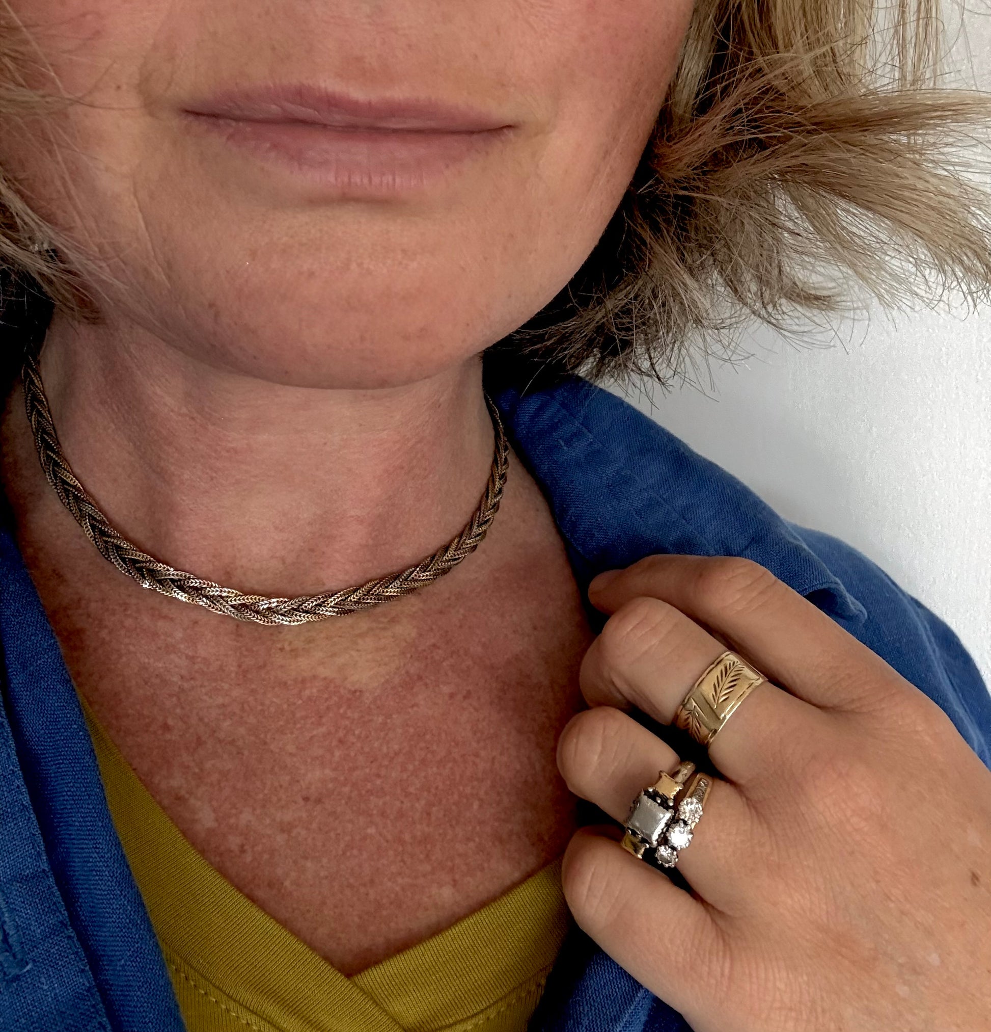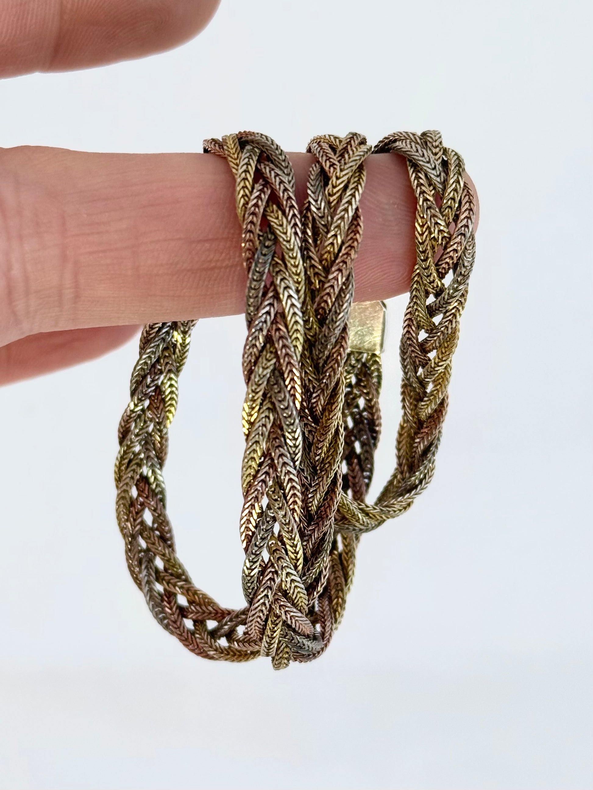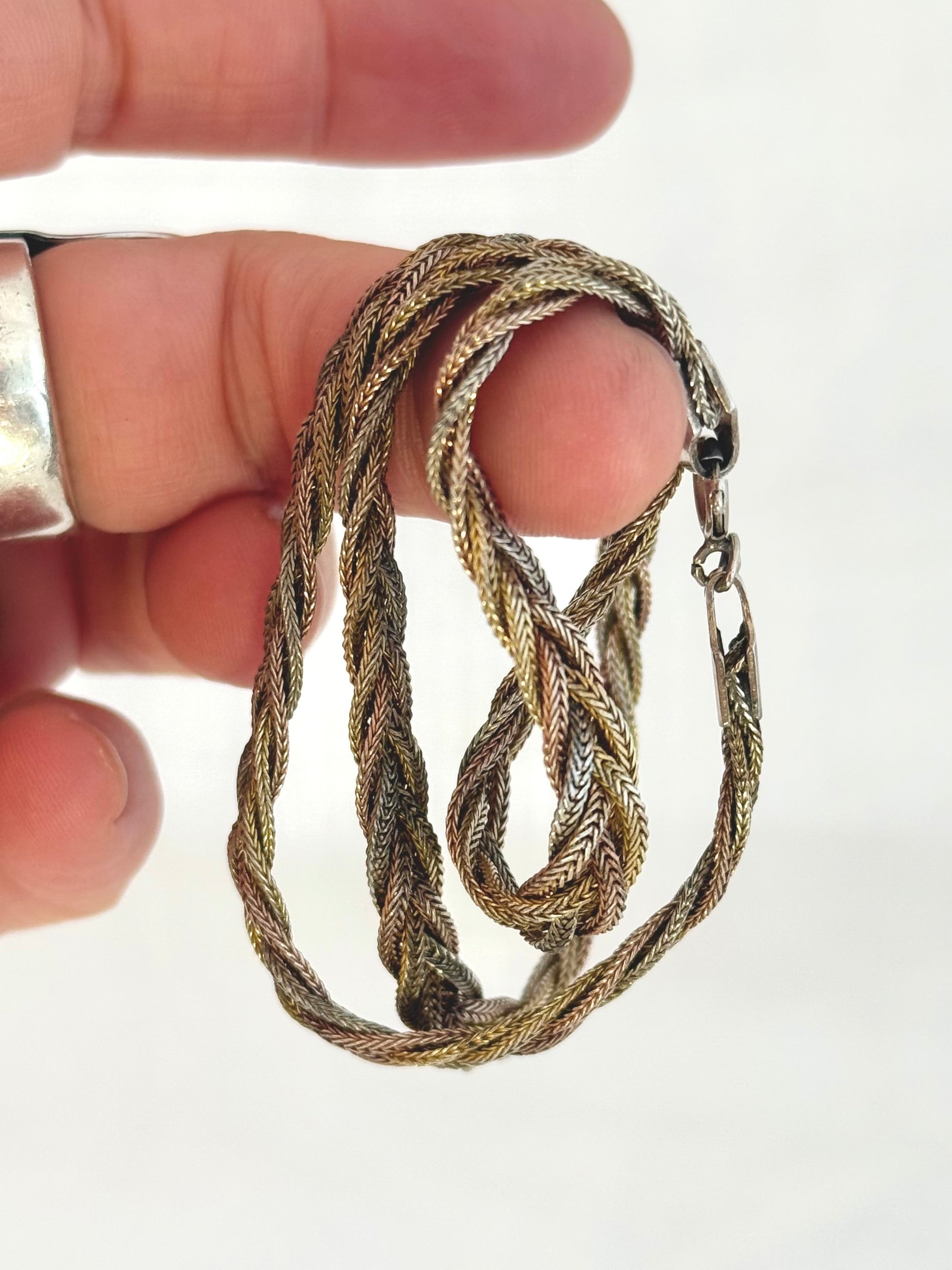 A retro statement, this tri colour 925 silver and rose gold and yellow gold plated woven chain necklace and bracelet set is in wonderful vintage condition. It will be a much loved and an easy to wear accent necklace and bracelet.