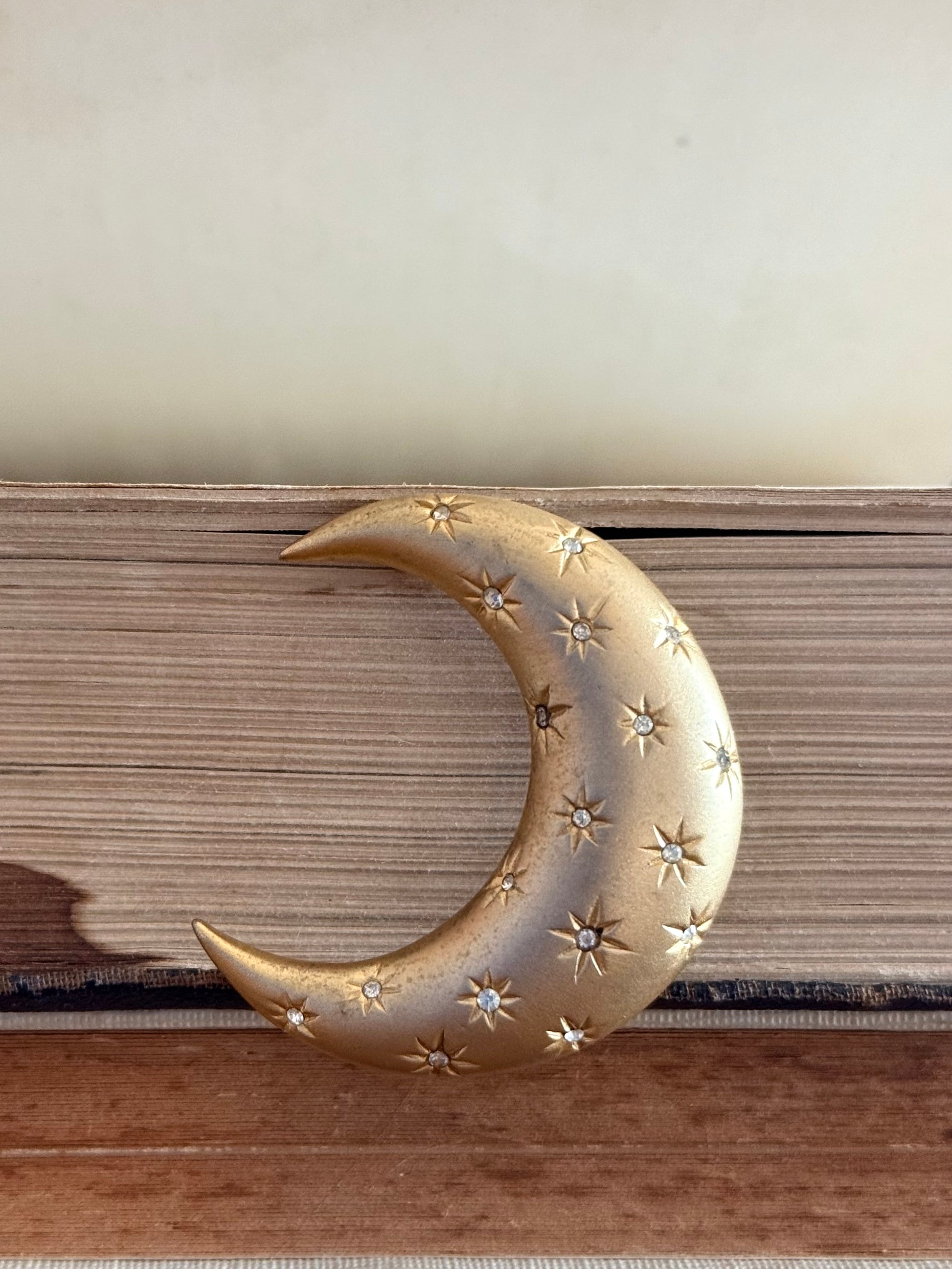 .1980s crescent moon puffy gold diamanté star accent costume moon brooch