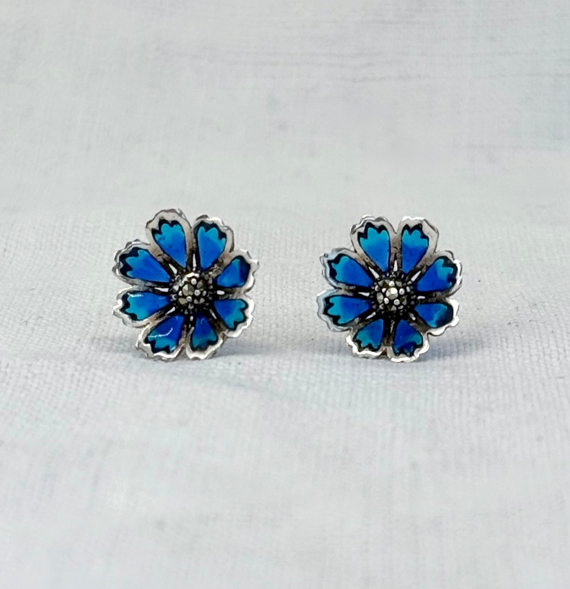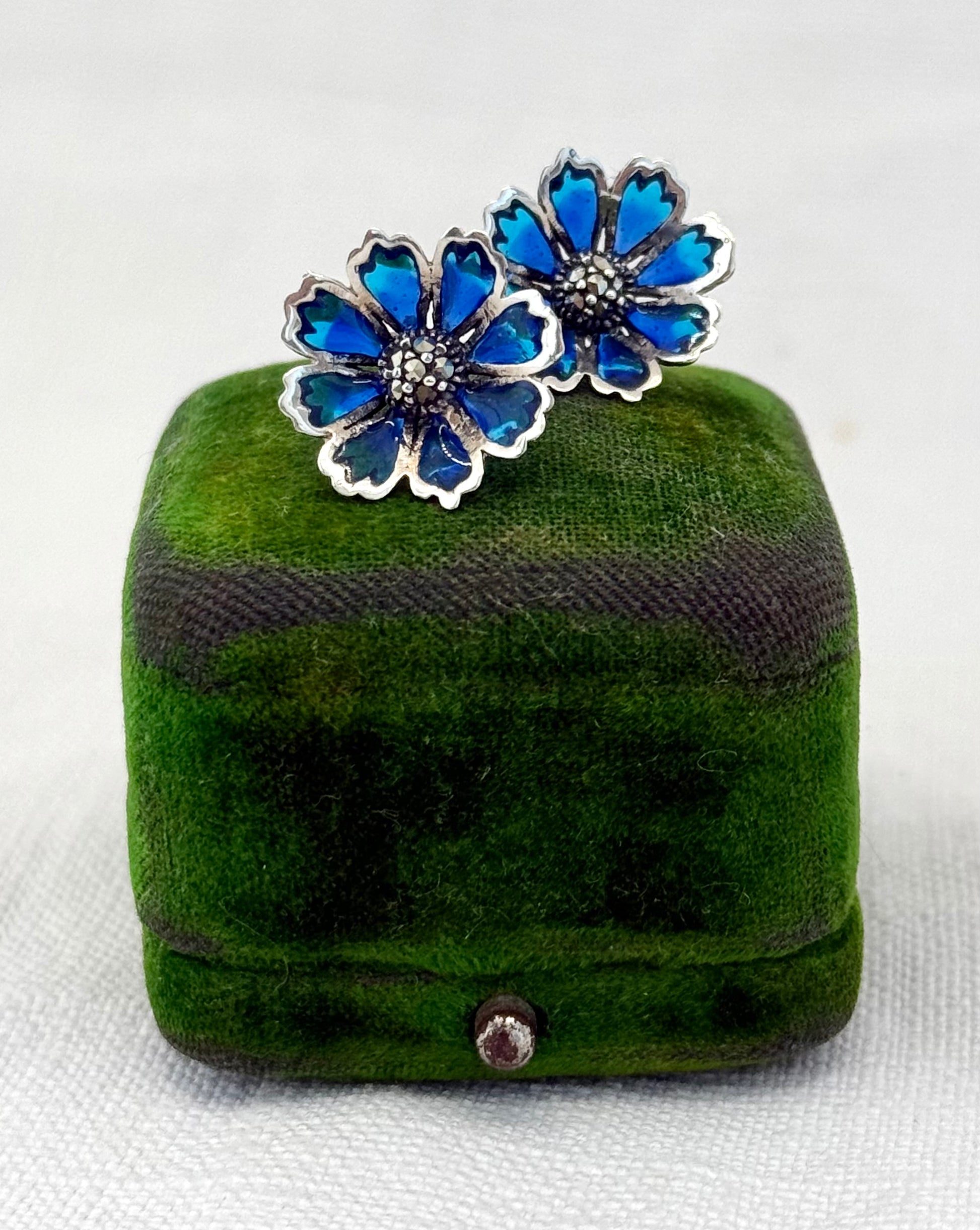 Glorious and beautiful, this lovely pair of blue hue Plique a Jour enamel earrings are studded with a marcasite daisy centre.
