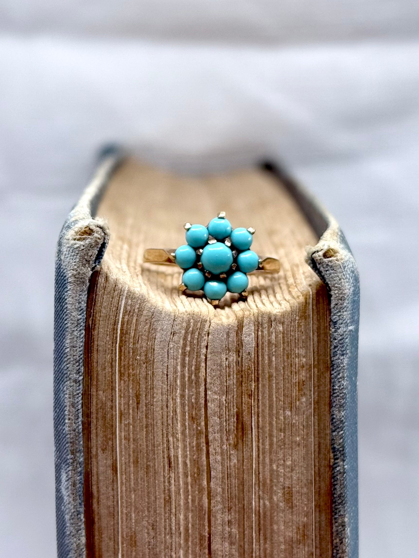 This wonderful Edwardian revival 9ct yellow gold dress ring features a beautiful flower of 9 turquoise gemstones clustered in a floral and petal design.