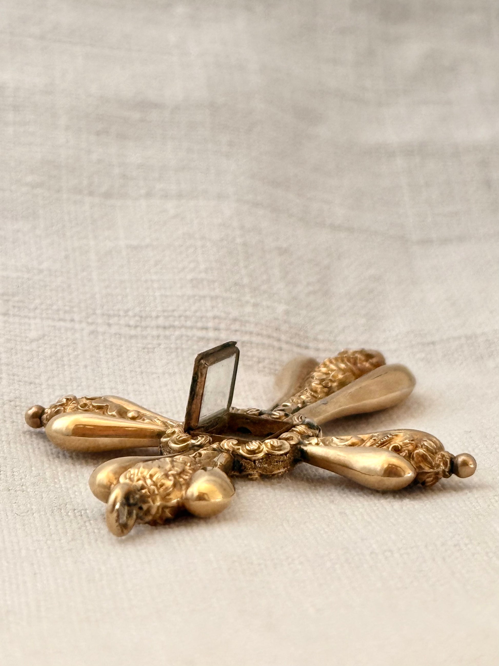 The cross locket had historically been restored - visible at the bottom of the locket frame. The repair is strong and not truly visible in wear. This rare mourning locket is priced according to the repair, also noting that the chains pictured are not included in this sale.
