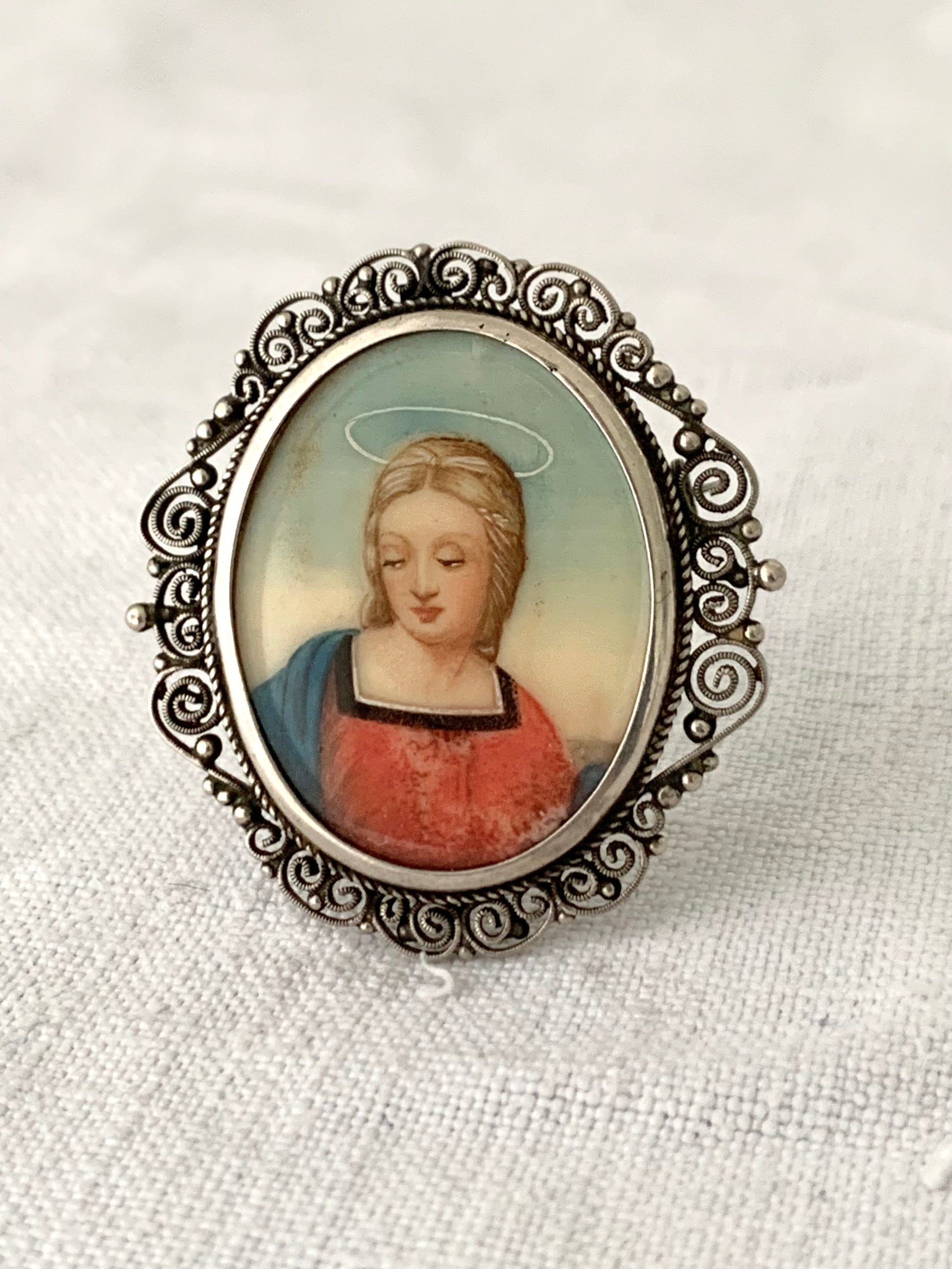 .800 1940s Holy Virgin Mother Mary Hand Painted artisan miniature Mother Mary 800 silver fine filigree frame brooch