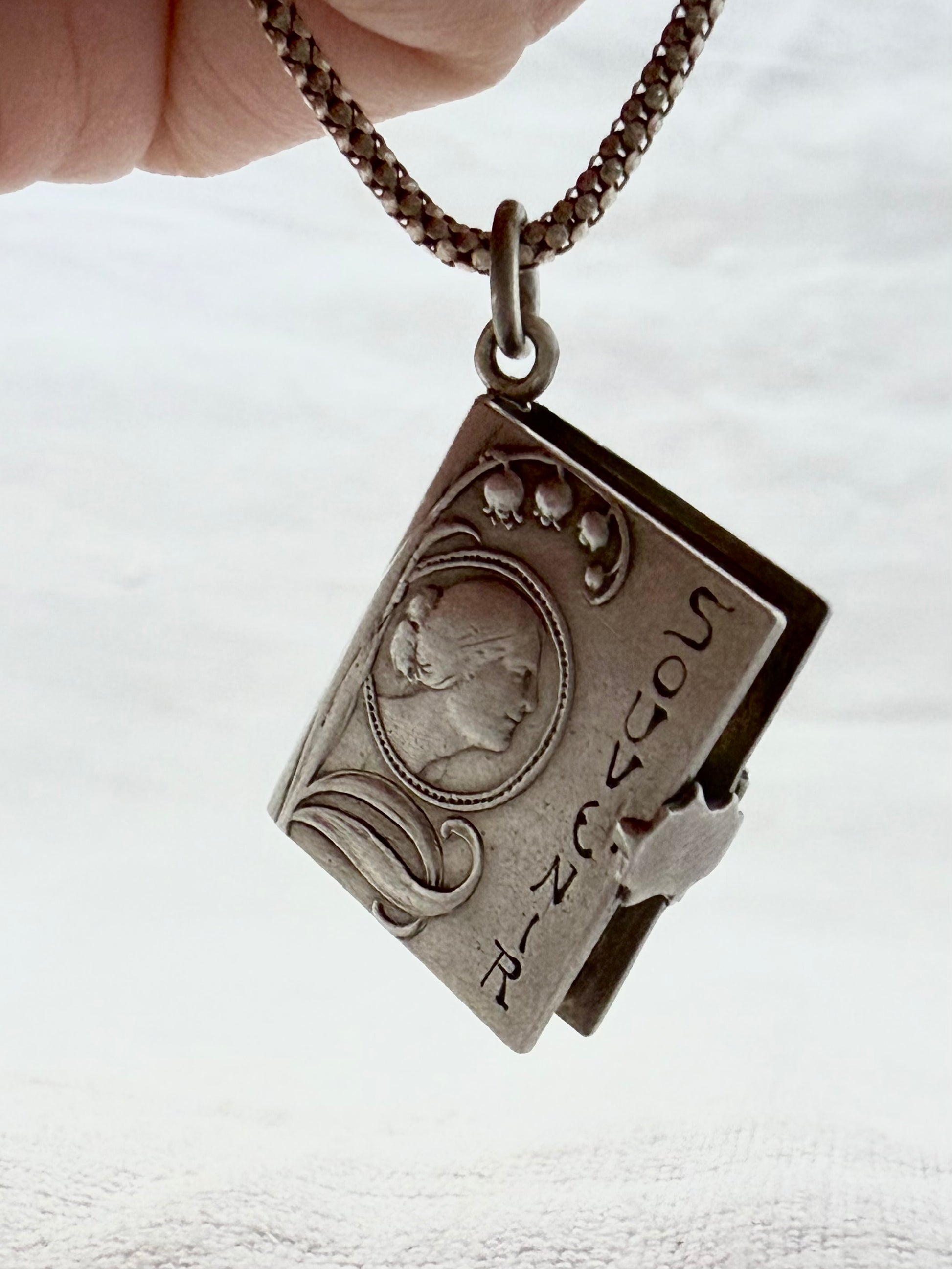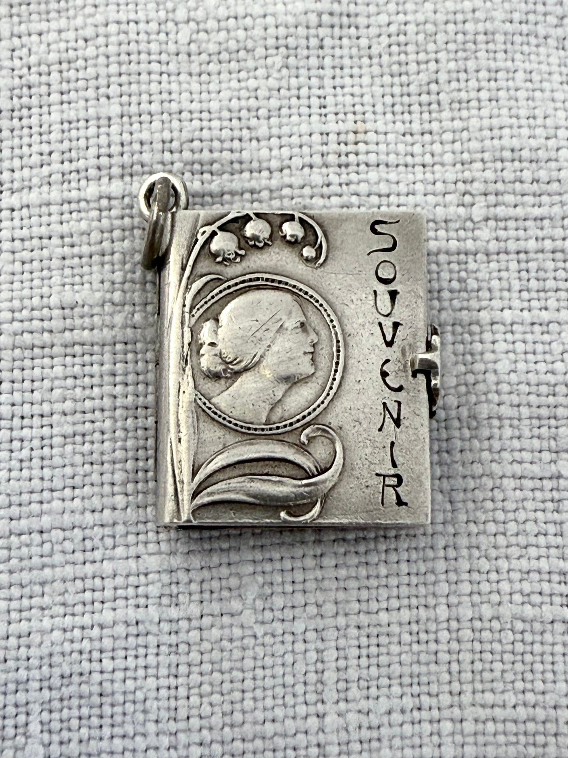 .925 1900s Art Nouveau French silver souvenir book form photo locket antique collectors Belle Epoque booklet pendant