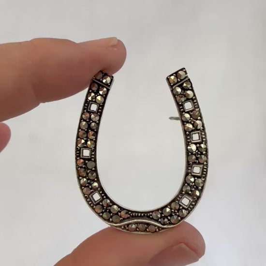 Brilliant in glamour and symbolism, this large and lovely Edwardian to early Art Deco silver and sparkly marcasite gemstone horseshoe brooch holds sentiment of luck and a promise of an endearing bond.
