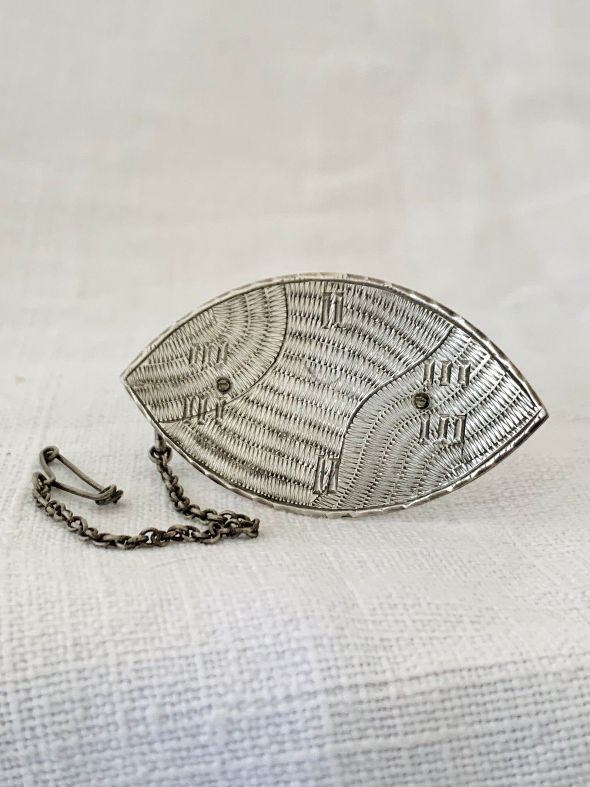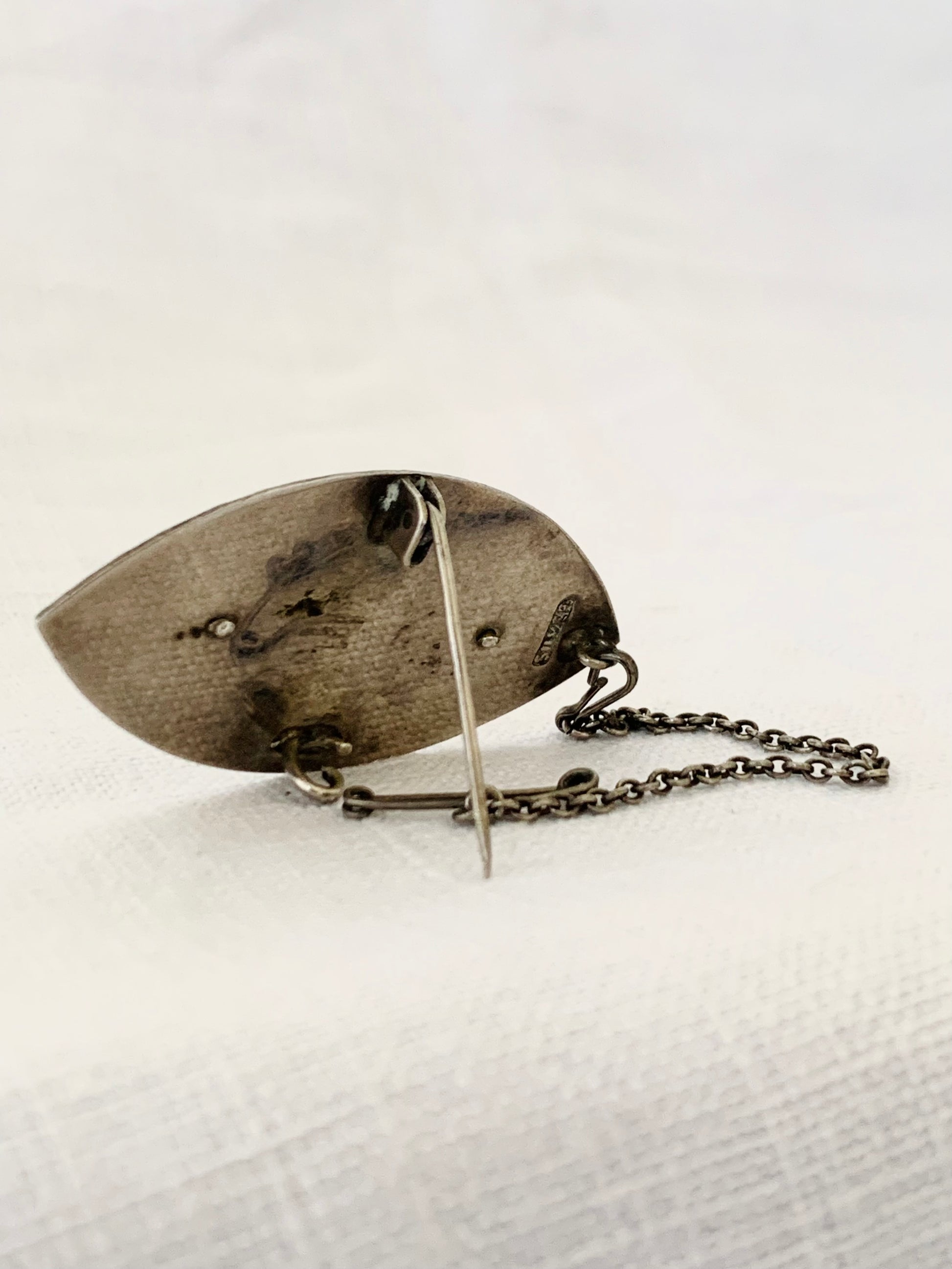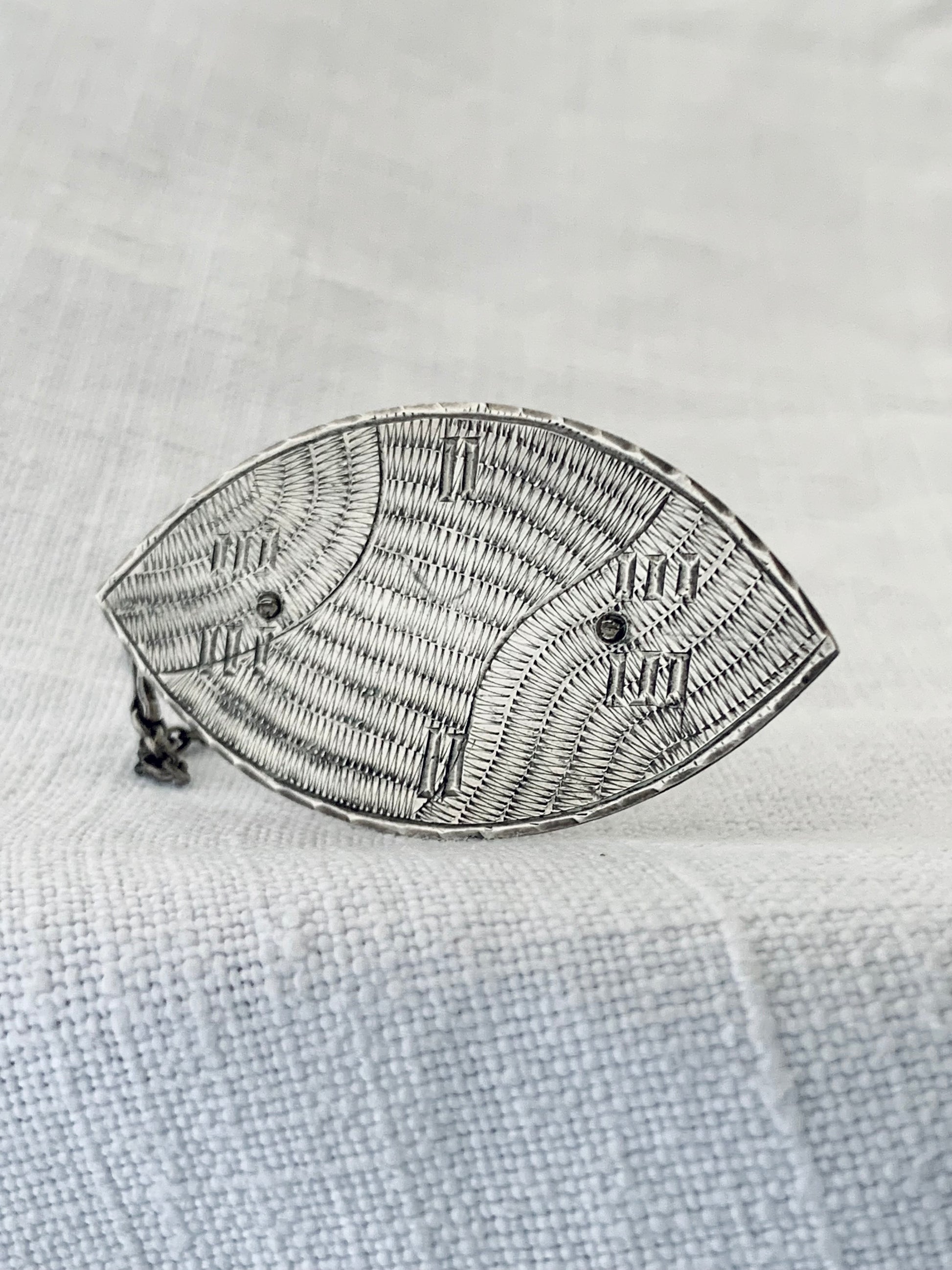 .925 1950s 1960s artisan made modernist tribal shield hand engraved hand made ellipse shape ethnic style shield brooch