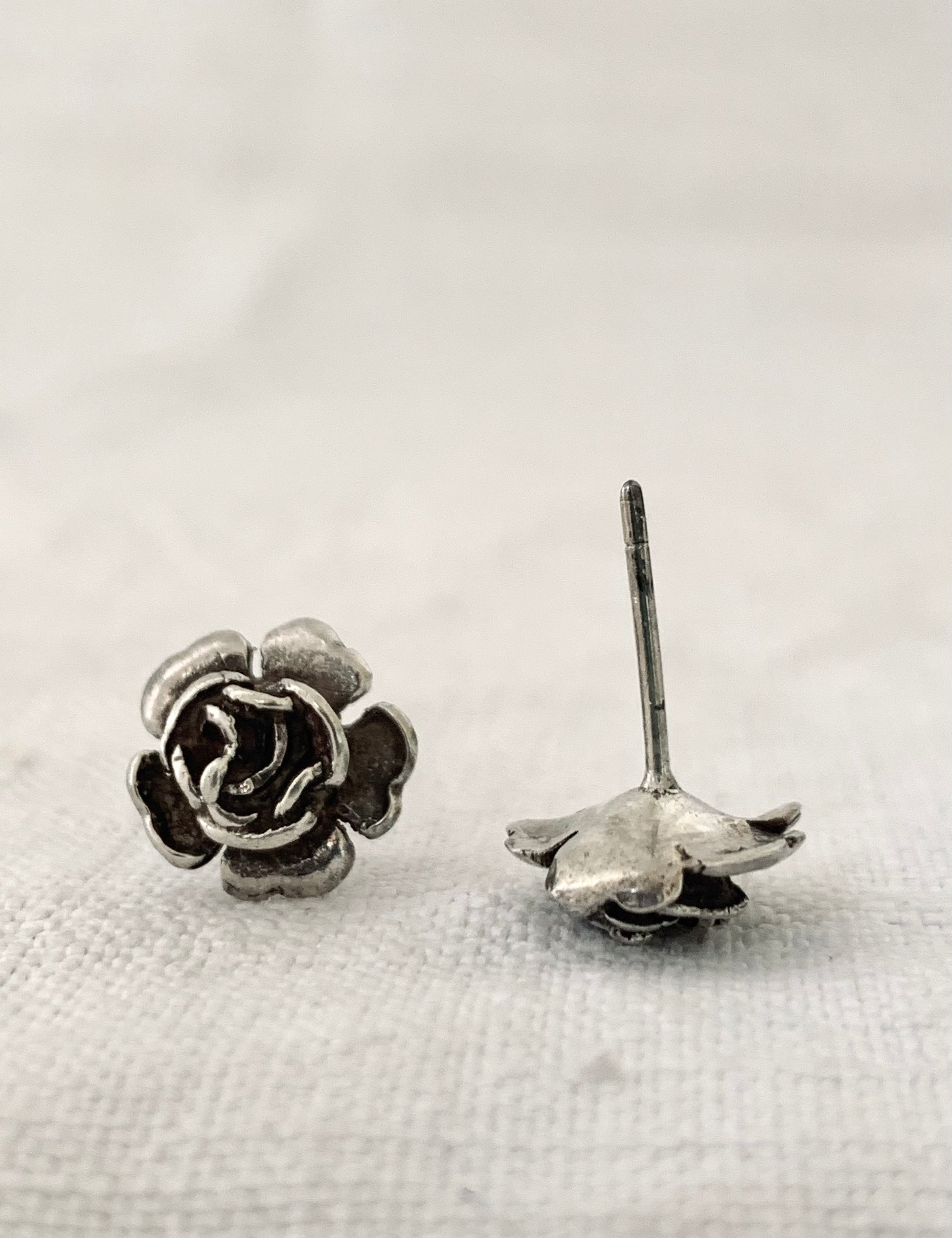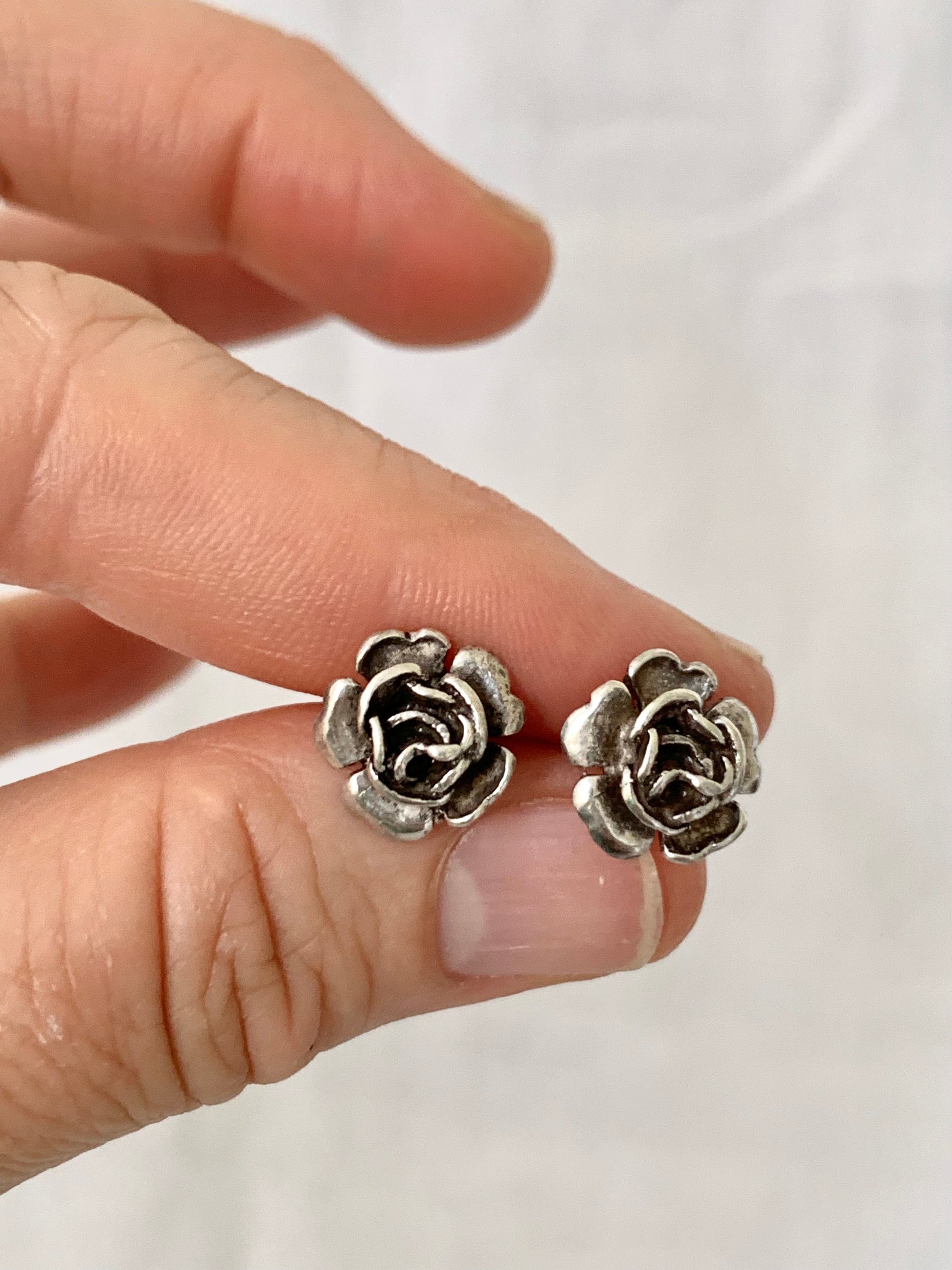 Marked 925 silver, the rose push in flower earrings are studio made, chunky and 3 dimensional.