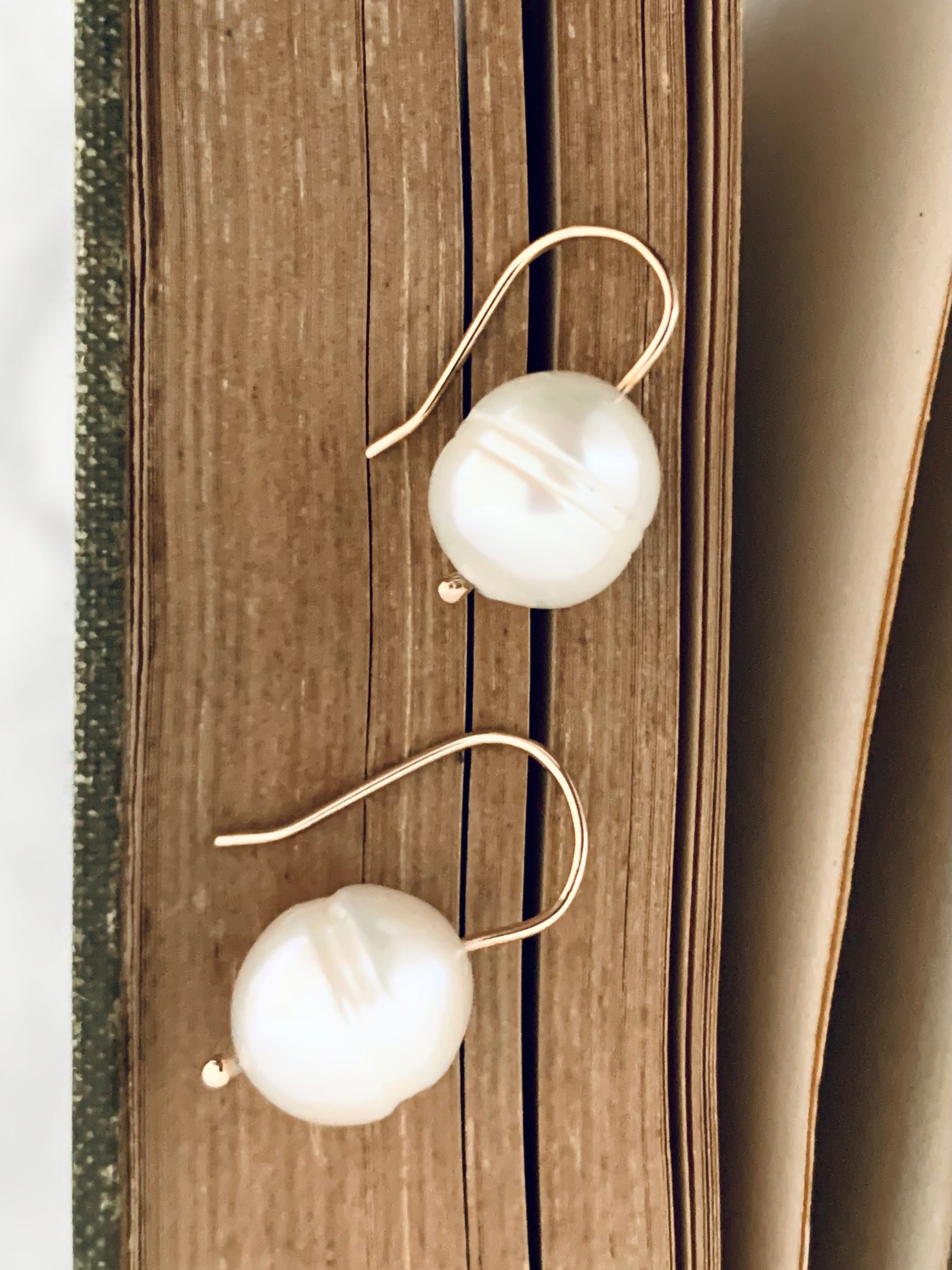 A classic and truly elegant pair of short drop 9ct gold earrings with each a nicely sized 10mm diameter crips white large pearl bead laced through a 20mm 9ct gold hook finding.