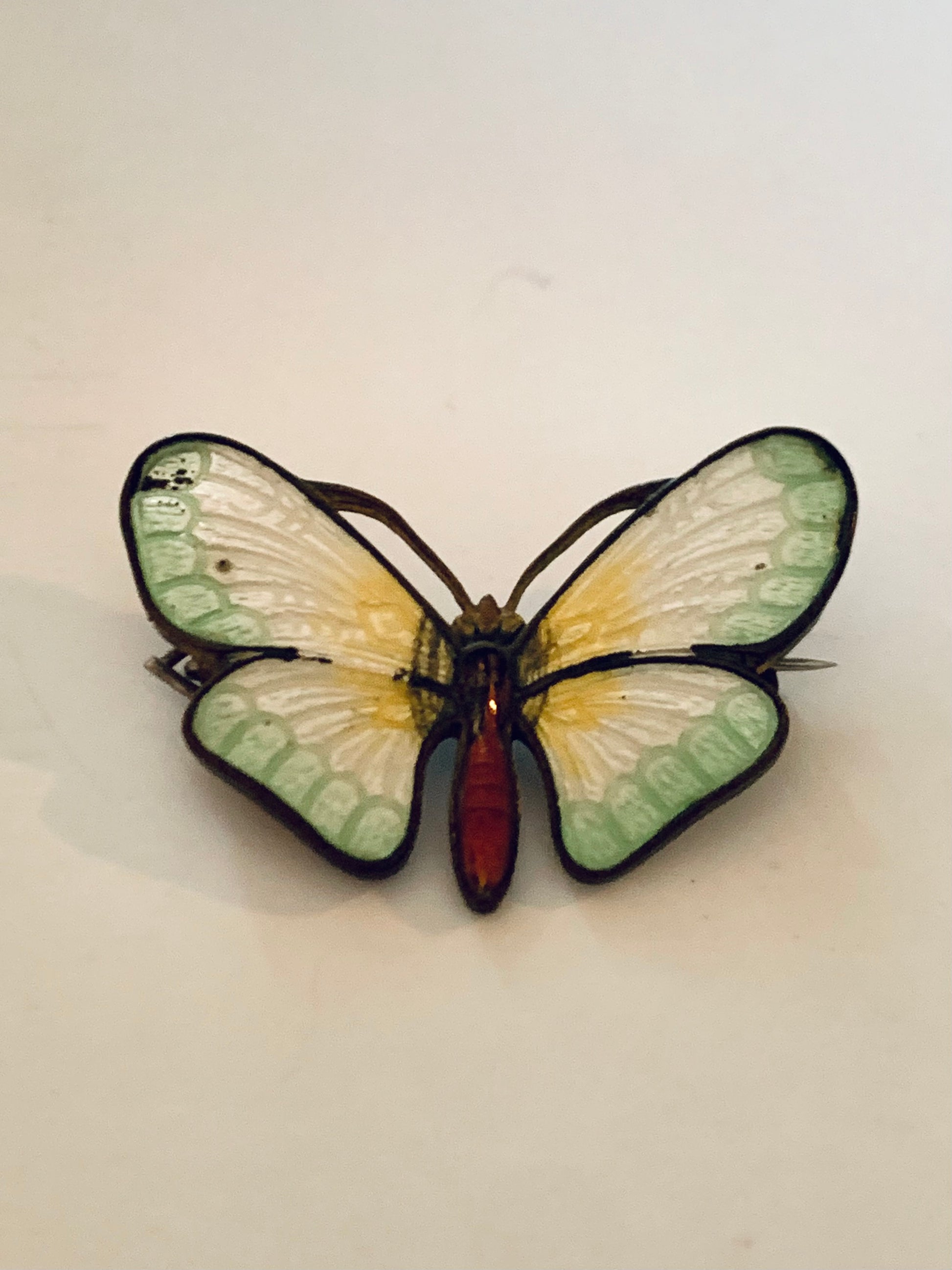 A much loved vintage antique enamel butterfly brooch that has the softest green and yellow and white toned enamel wings with a red body - she’s beautiful but do note that her enamel has chipped on various spots due to age and wear.