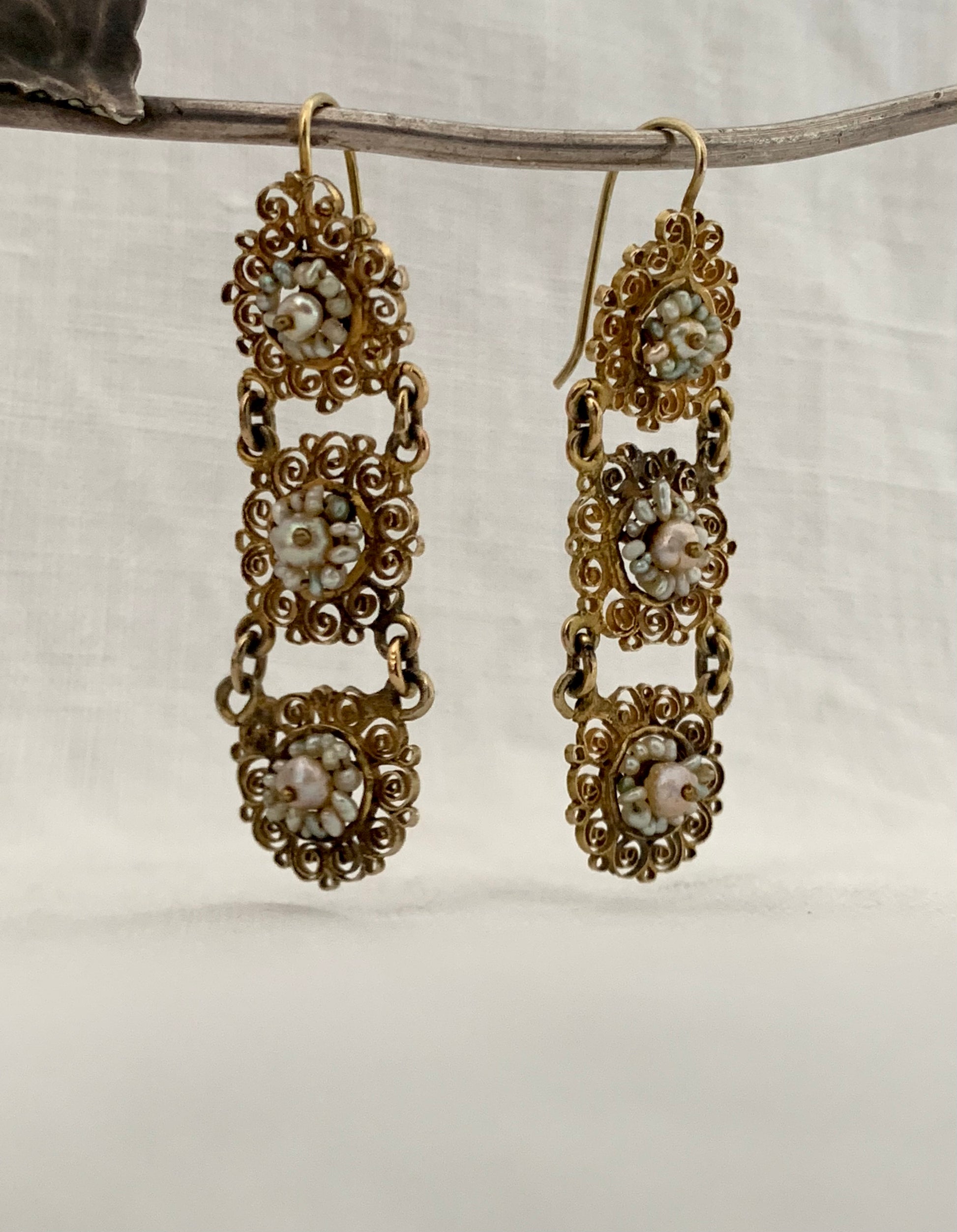 Rare Estate find, antique Georgian 3 fine gold filigree disc dangle earrings with central floral accent of dove grey and champagne coloured seed pearls.