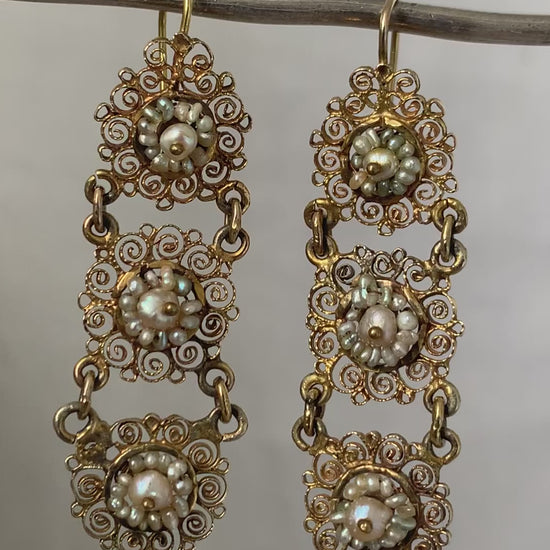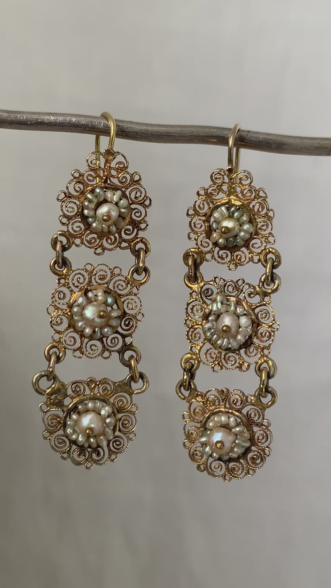 .1800s .1820s early rare Collectors find Early Georgian era Sicilian Italian antique gold and pearl highly sought after fine high carat gold filigree dangle estate find earrings.